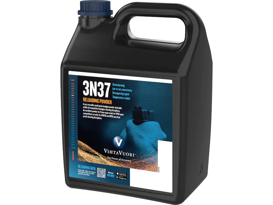 The N300 series powders are single base porous powders for handguns. Vihtavuori’s 3N37 handgun powder was originally developed for .22 rimfire cartridges, but has since proven to be very versatile and desirable within all competitive handgun shooting disciplines. The 3N37 is tubular, porous powder type with grain dimensions of 0,6 mm length and 0,6 mm diameter. The symmetrical grain size makes metering a breeze in powder measures. The burning rate of the 3N37 is close to N350 and on the medium scale of handgun powders. This is an excellent powder for 9 mm major loads for IPSC open competitions and it’s very popular in USPSA and IPSC practical pistol shooting disciplines. In addition to practical shooting, 3N37 is also widely used as a submachine gun powder. 3N37 offers consistent, extreme precision, with clean burning – and that is why it is used by the best shooters in the world.